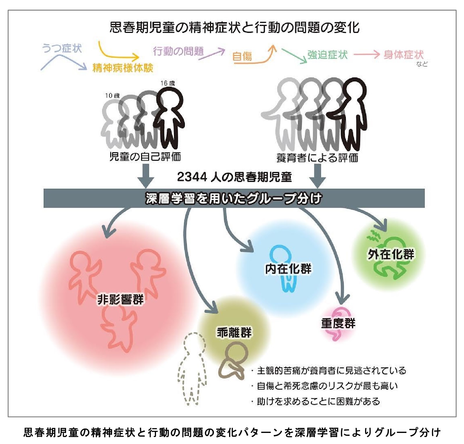 - 思春期児童の精神症状の多様な変化パターンが5つの特徴的なグループに分けられることを見出しました。そのうち本人の苦痛が養育者から見逃されていた一群は自傷や希死念慮のリスクが高く周囲に助けを求めない傾向がありました。