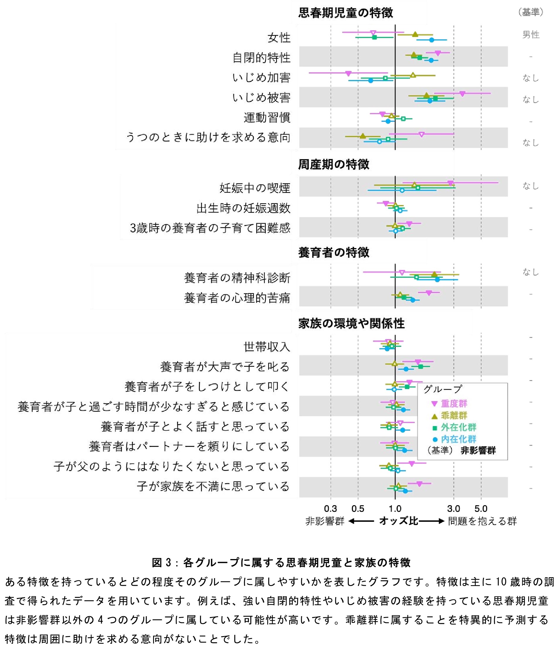 深層学習技術で軌跡のパターンを分類して見出した5つのグループ(図2)は、①問題が最小限の「非影響群」(60.5%)、②持続的または悪化する抑うつ・不安等の問題を示す「内在化(注3)群」(16.2%)、③児童の主観的な問題が養育者に見過ごされた「乖離群」(9.9%)、④持続的な行動の問題等を示す「外在化(注3)群」(9.6%)、⑤様々な症状の領域で慢性的な重度の問題を呈する「重度群」(3.9%)でした。自傷行為と希死念慮のリスクが最も高かった「乖離群」は、周囲に助けを求めようとしない特徴がありました(図3)。