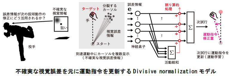 - 身体動作時に視覚誤差が生じたとき、その誤差情報がDivisive normalizationと呼ばれる計算様式によって処理され、後の運動指令の修正に活用されることを明らかにしました。