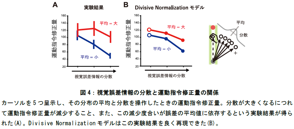 まず、2つもしくは3つのカーソルを同時に呈示した際の運動指令修正量を調べたところ、その誤差の組み合わせに複雑に依存した変化パターンを示しました(図3A)。統計量に基づいて視覚誤差を推定する従来のモデルでは、この複雑なパターンを説明することはできませんでした。しかし、複数のカーソルそれぞれによって伝達される視覚誤差情報がDivisive normalization則によって統合され運動指令修正量が定まる数理モデルを構築したところ、その複雑なパターンを忠実に再現できることが明らかになりました(図3B)。さらに、正規分布に基づいて生成された視覚誤差を5つのカーソルで与えた場合、運動指令修正量が誤差情報の平均値と分散値にどのように依存するかを我々の新しいモデルによって予測しました。運動指令修正量が誤差情報の分散の増大とともに低下するという従来よく知られた現象を予測するばかりでなく、この低下の度合いが誤差情報の平均値に依存するという予測が得られ、実験結果ともよく合致しました(図4)。